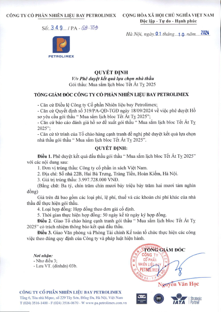 Quyết định phê duyệt kết quả lựa chọn nhà thầu gói thầu Mua sắm lịch bloc Tết Ất Tỵ 2025